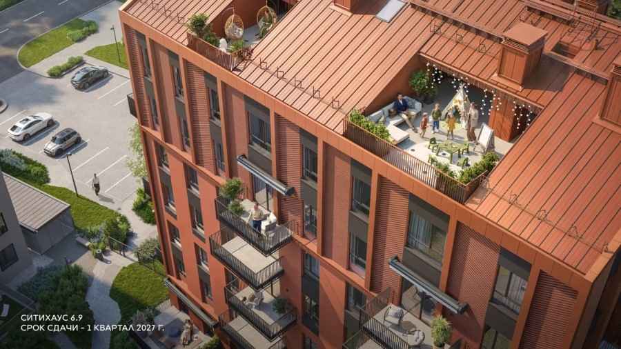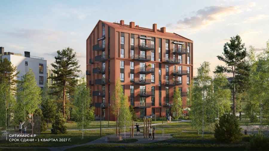 Ситихаус 6.9 задуман как акцентный дом, который станет ярким элементом квартала. Его архитектура выполнена в цветовой гамме, отражающей природные мотивы соснового бора и глины, с использованием оттенков зеленого, серого и терракоты. Уникальная концепция дома задает тон всей линии застройки и подчеркивает его статус.